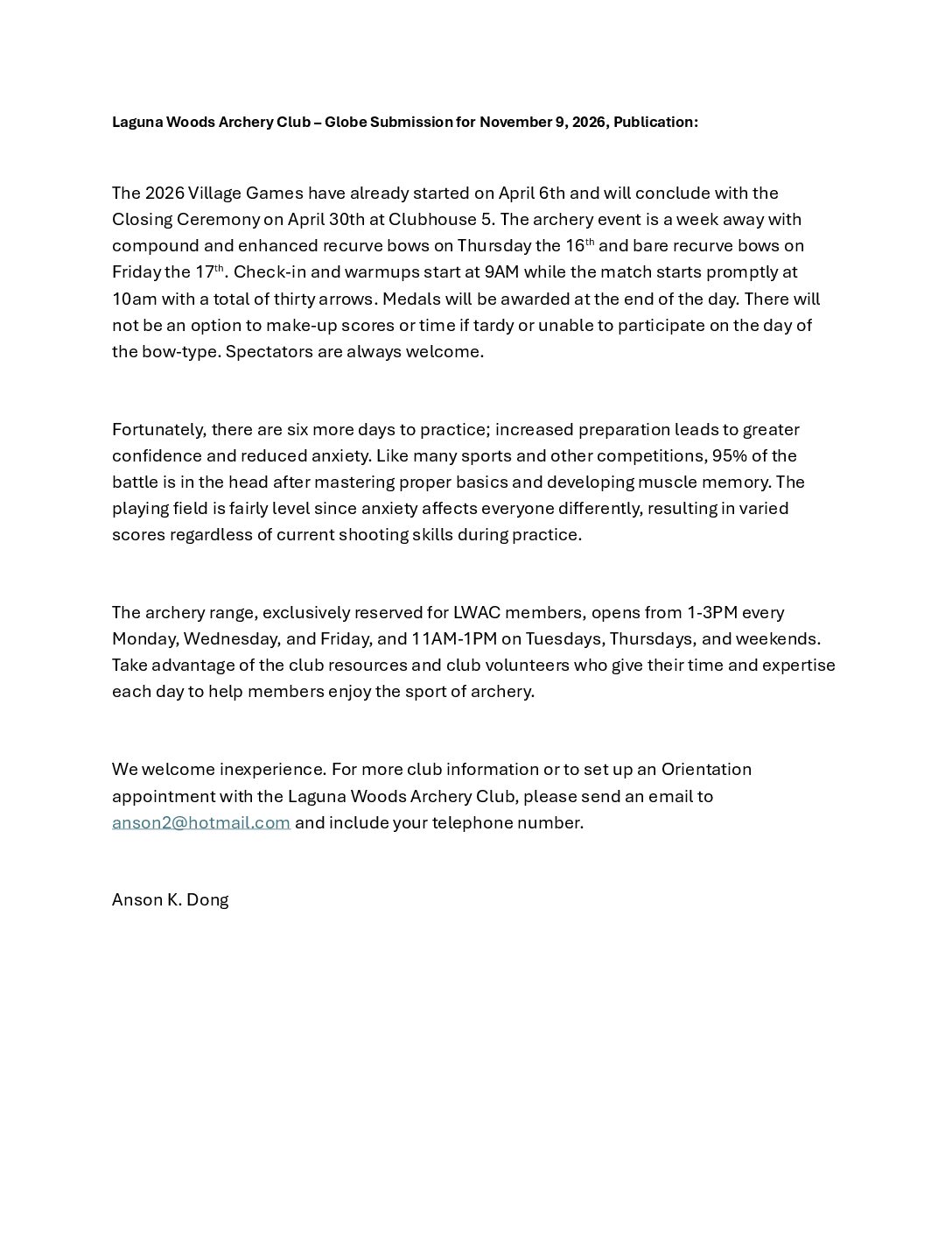 The mission and goal of the Laguna Woods Archery Club (hereinafter “LWAC”) are to offer the benefits of archery as recreation, sport, and camaraderie to all Laguna Woods residents in a relaxing, fun, and safe environment. The annual club membership fee provides insurance for members as required by the City/GRF. The fee does NOT sponsor any external institution. It directly funds the LWAC’s insurance premiums and range maintenance. Training, coaching, and archery equipment are provided to club members without cost.