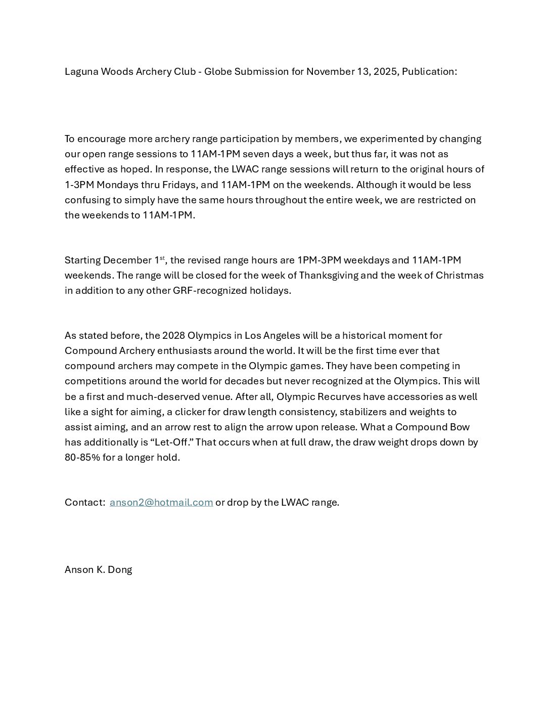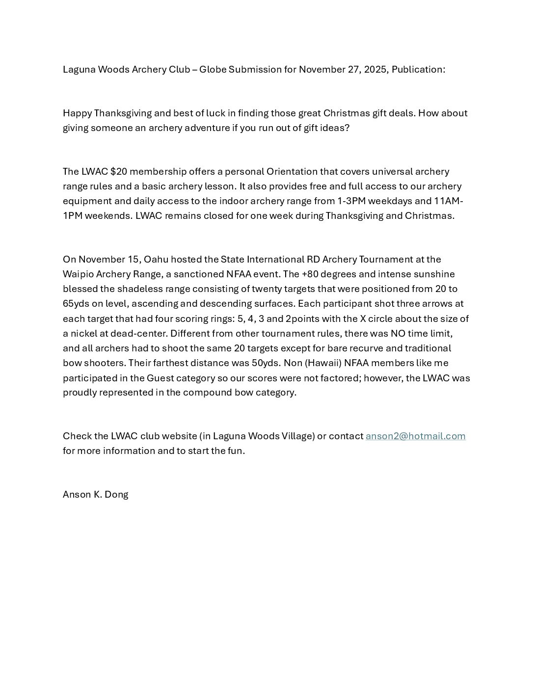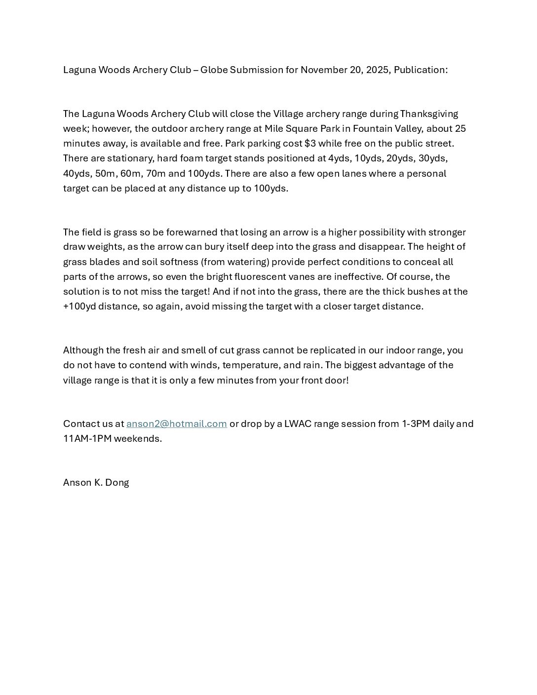 The mission and goal of the Laguna Woods Archery Club (hereinafter “LWAC”) are to offer the benefits of archery as recreation, sport, and camaraderie to all Laguna Woods residents in a relaxing, fun, and safe environment. The annual club membership fee provides insurance for members as required by the City/GRF. The fee does NOT sponsor any external institution. It directly funds the LWAC’s insurance premiums and range maintenance. Training, coaching, and archery equipment are provided to club members without cost.