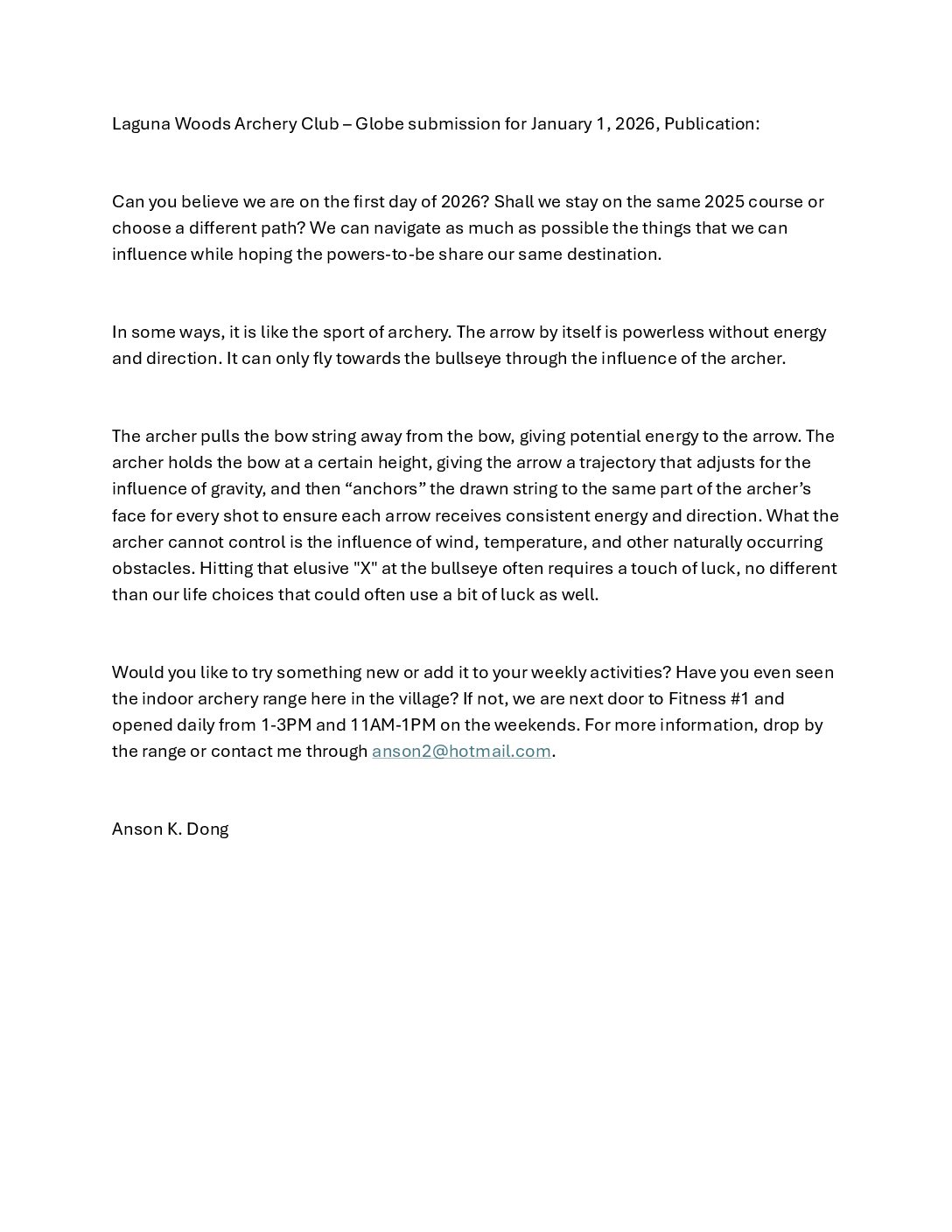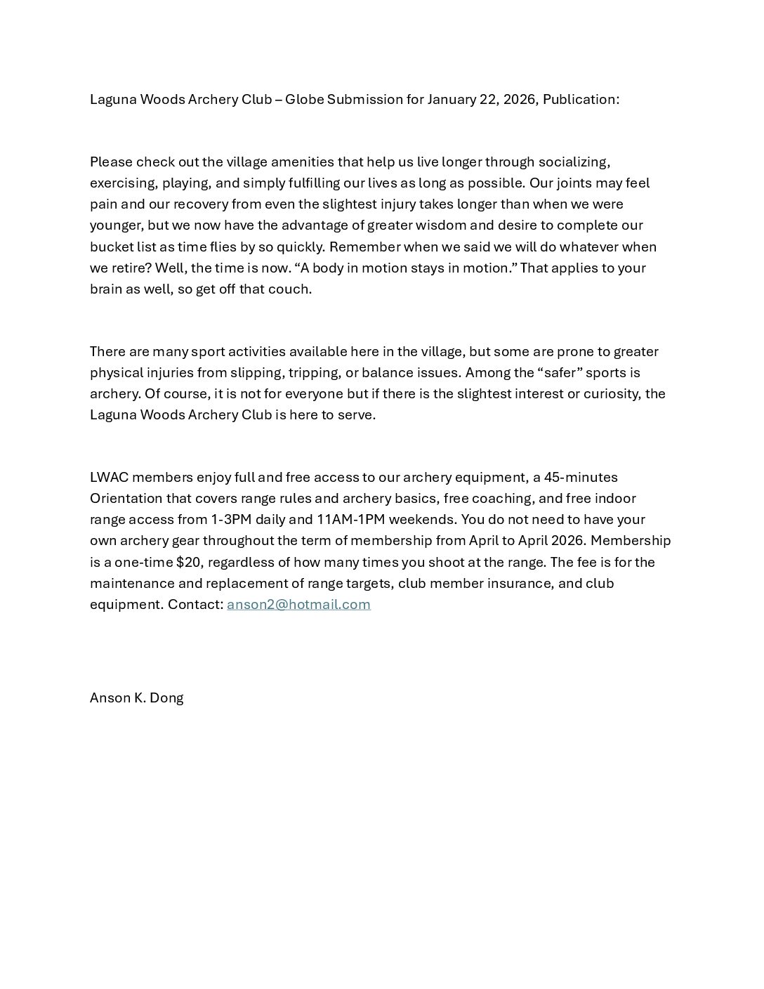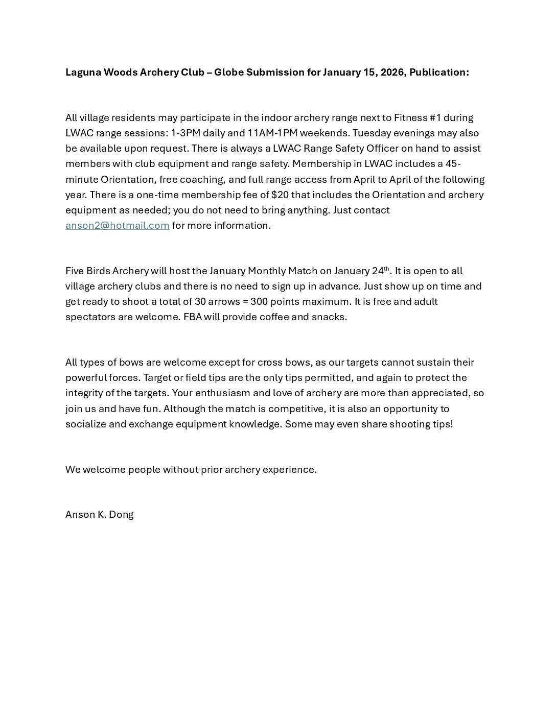 The mission and goal of the Laguna Woods Archery Club (hereinafter “LWAC”) are to offer the benefits of archery as recreation, sport, and camaraderie to all Laguna Woods residents in a relaxing, fun, and safe environment. The annual club membership fee provides insurance for members as required by the City/GRF. The fee does NOT sponsor any external institution. It directly funds the LWAC’s insurance premiums and range maintenance. Training, coaching, and archery equipment are provided to club members without cost.