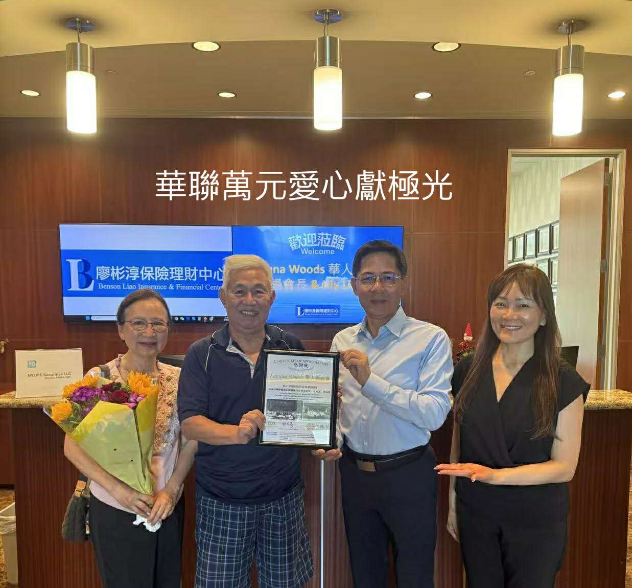 6/16/2025上午11時楊平飛會長和李瑛副會長帶著蔣棠夫婦發起的"華聯萬元愛心獻極光"共計收到支票21張包括蔣棠先生夫婦捐款4,000元,總金額$10,120元送交給廖彬淳董事長轉贈給極光打擊樂團。廖董事長當場即表示不論是現場捐款直接寄支票!或是今天的捐款!他代表極光致十二萬分感謝!