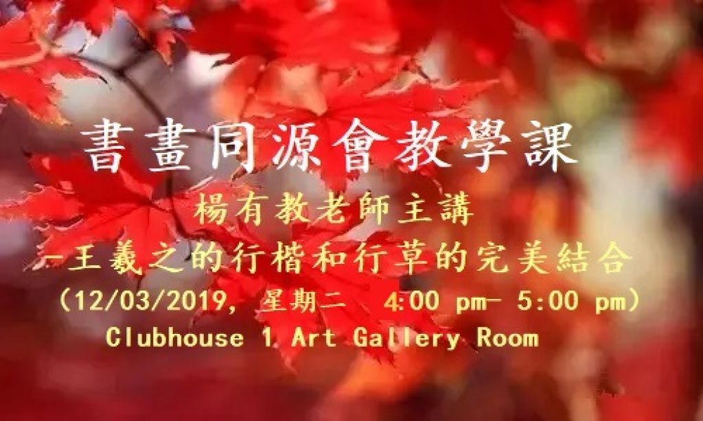 書畫同源會教學課: 楊有教老師主講-王羲之的行楷和行草的完美結合 (12/03/2019, 星期二 4:00 pm- 5:00 pm, CH 1 Art Room)